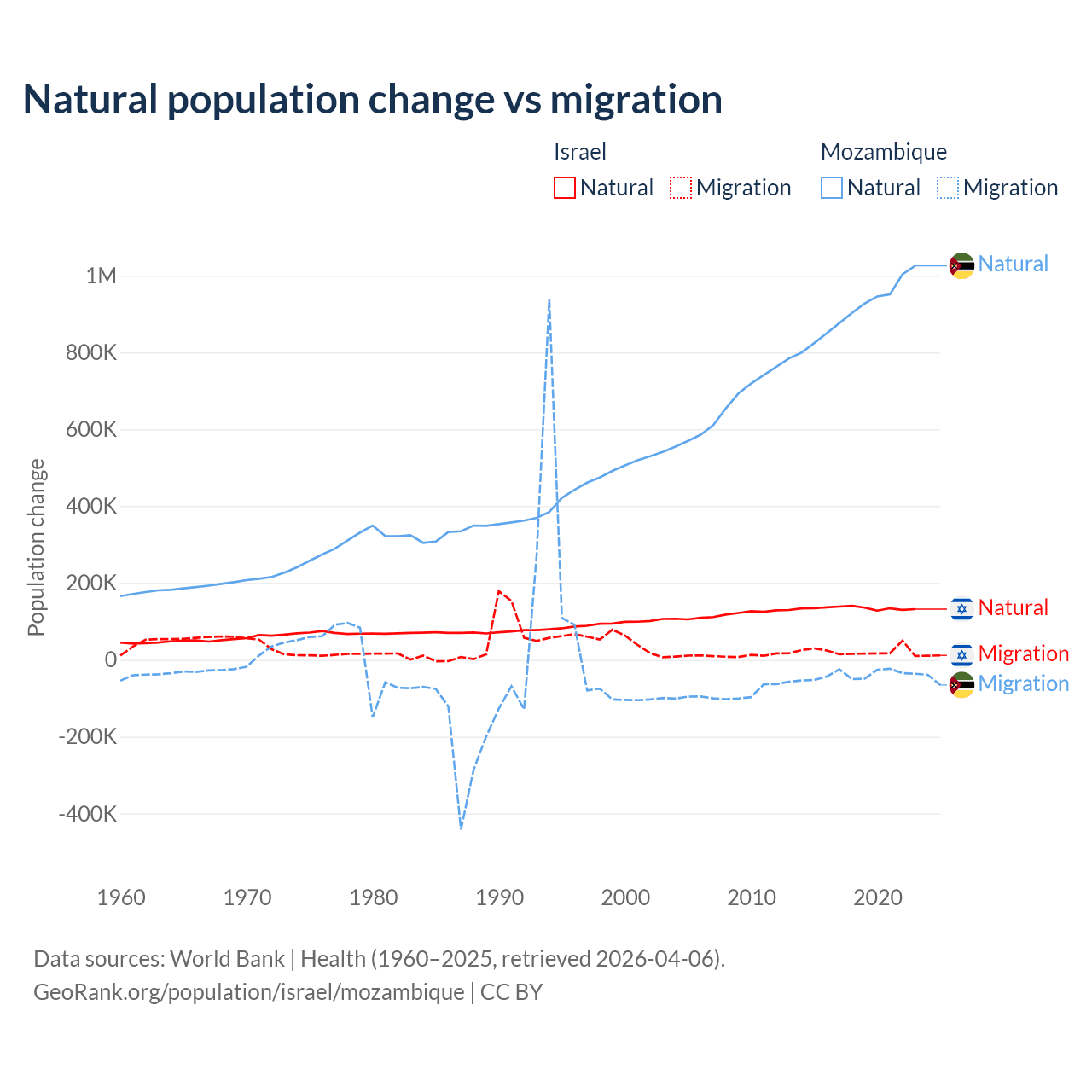 Over the last 10 years, 86% of the population change in Israel is from natural causes (a gain of 1,343,492 people) and 14% is from migration (a gain of 219,048 people). In Mozambique 95.9% is from natural causes (a gain of 9,108,203 people) and 4.15% is from migration (a loss of 393,923 people).