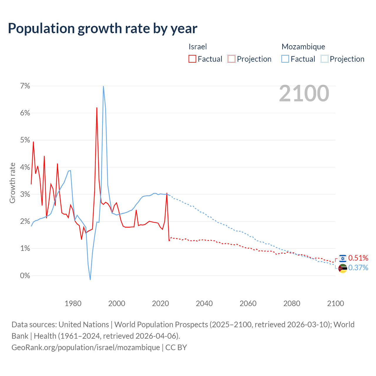 - For the last 10 years, Israel has had an average growth rate of +1.96% per year vs +2.99% in Mozambique.