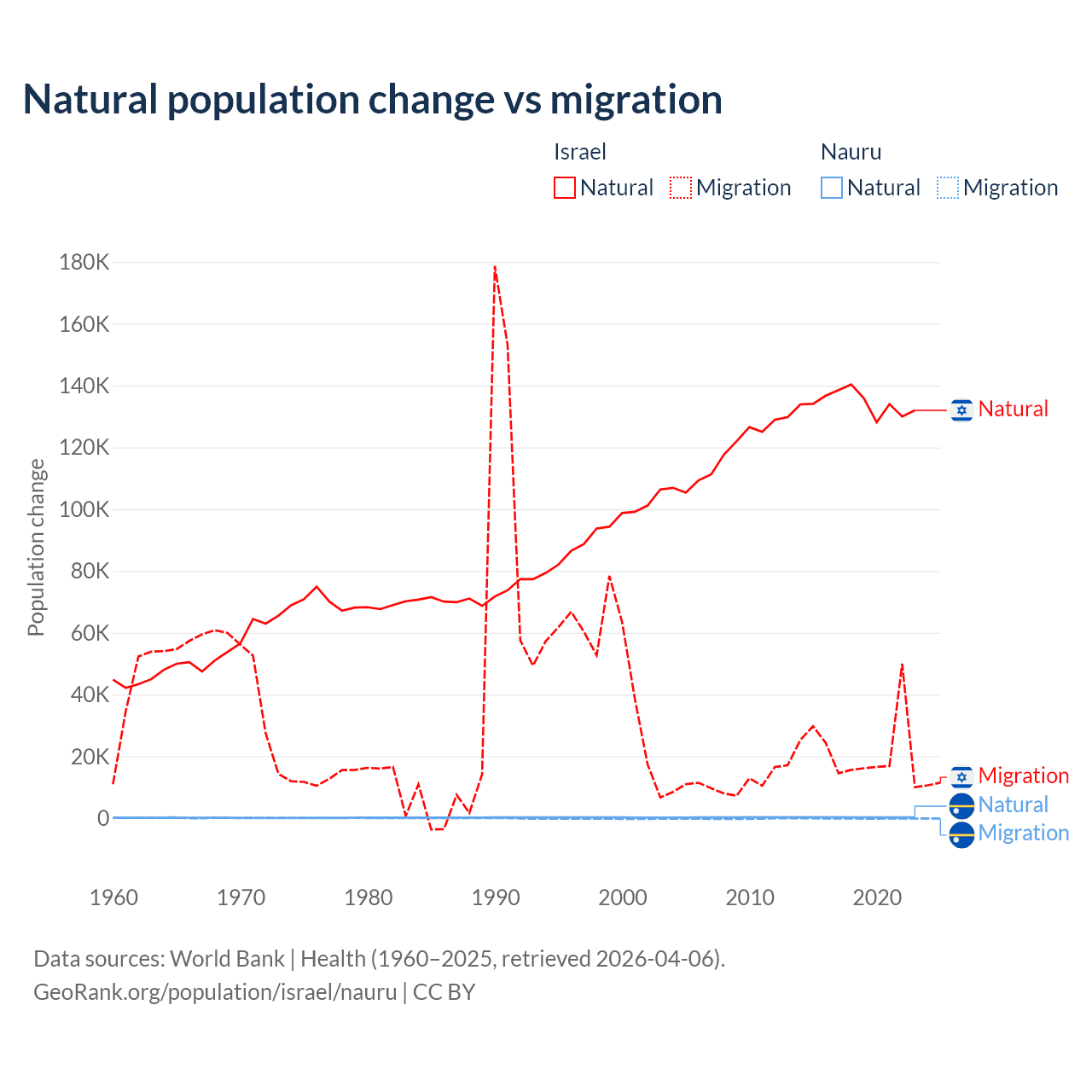 Over the last 10 years, 86% of the population change in Israel is from natural causes (a gain of 1,343,492 people) and 14% is from migration (a gain of 219,048 people). In Nauru 66.2% is from natural causes (a gain of 2,590 people) and 33.8% is from migration (a loss of 1,320 people).