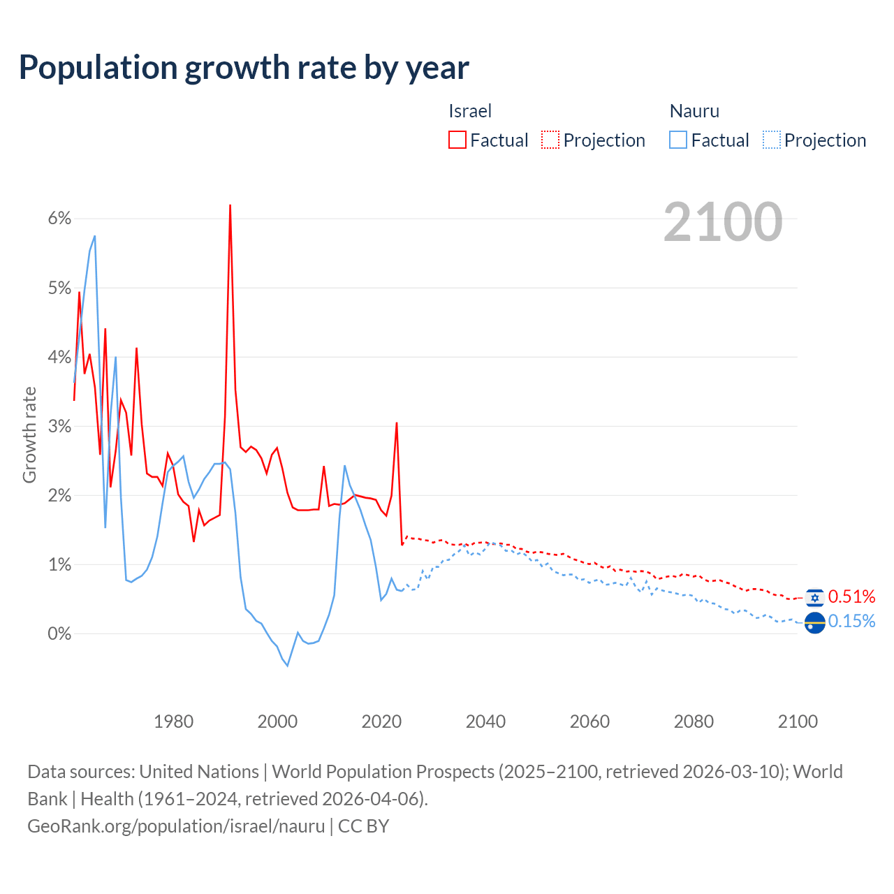 - For the last 10 years, Israel has had an average growth rate of +1.96% per year vs +1.17% in Nauru.