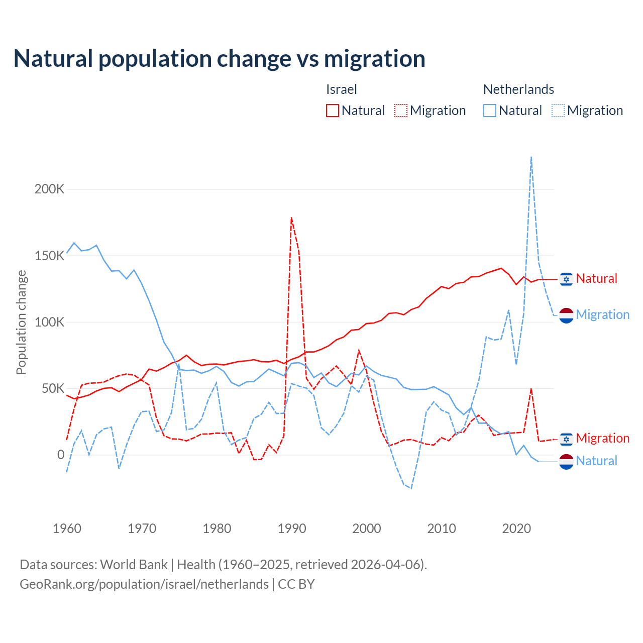 Over the last 10 years, 86% of the population change in Israel is from natural causes (a gain of 1,343,492 people) and 14% is from migration (a gain of 219,048 people). In the Netherlands 11.8% is from natural causes (a gain of 134,554 people) and 88.2% is from migration (a gain of 1,006,495 people).