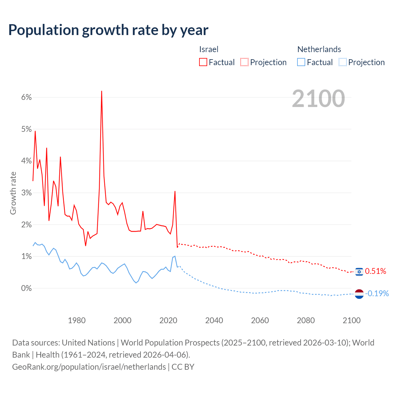- For the last 10 years, Israel has had an average growth rate of +1.96% per year vs +0.62% in the Netherlands.