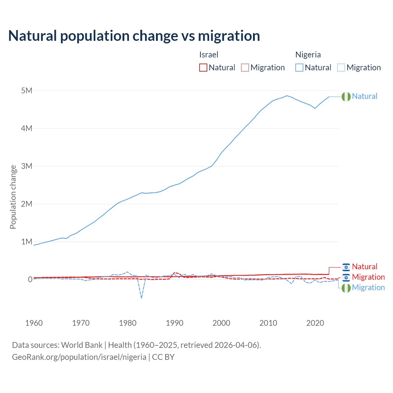 Over the last 10 years, 86% of the population change in Israel is from natural causes (a gain of 1,343,492 people) and 14% is from migration (a gain of 219,048 people). In Nigeria 99.2% is from natural causes (a gain of 47,163,517 people) and 0.77% is from migration (a loss of 368,103 people).