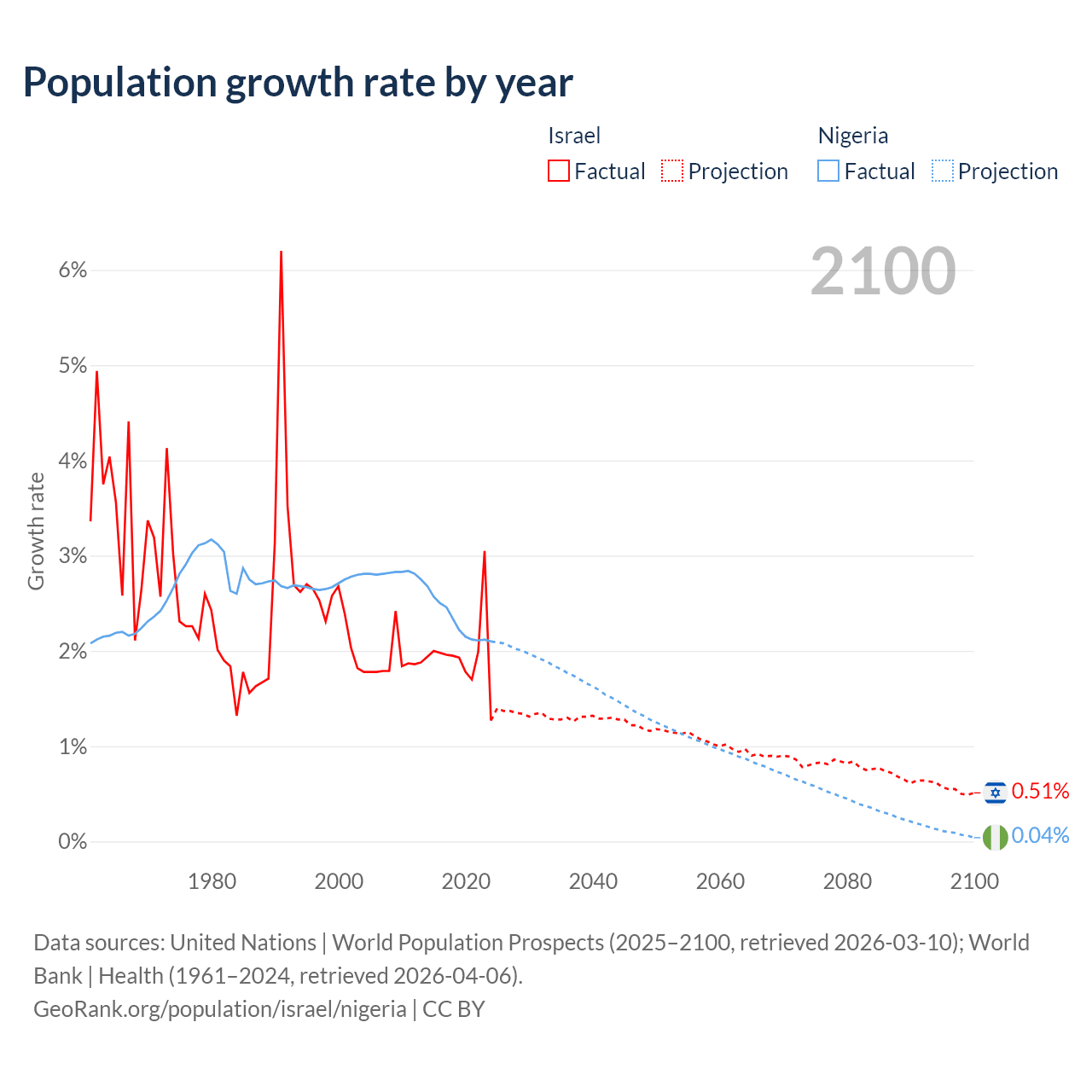 - For the last 10 years, Israel has had an average growth rate of +1.96% per year vs +2.31% in Nigeria.