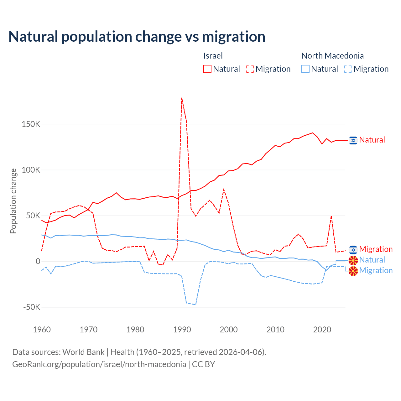 Over the last 10 years, 86% of the population change in Israel is from natural causes (a gain of 1,343,492 people) and 14% is from migration (a gain of 219,048 people). In North Macedonia 6.45% is from natural causes (a loss of 12,585 people) and 93.5% is from migration (a loss of 182,429 people).