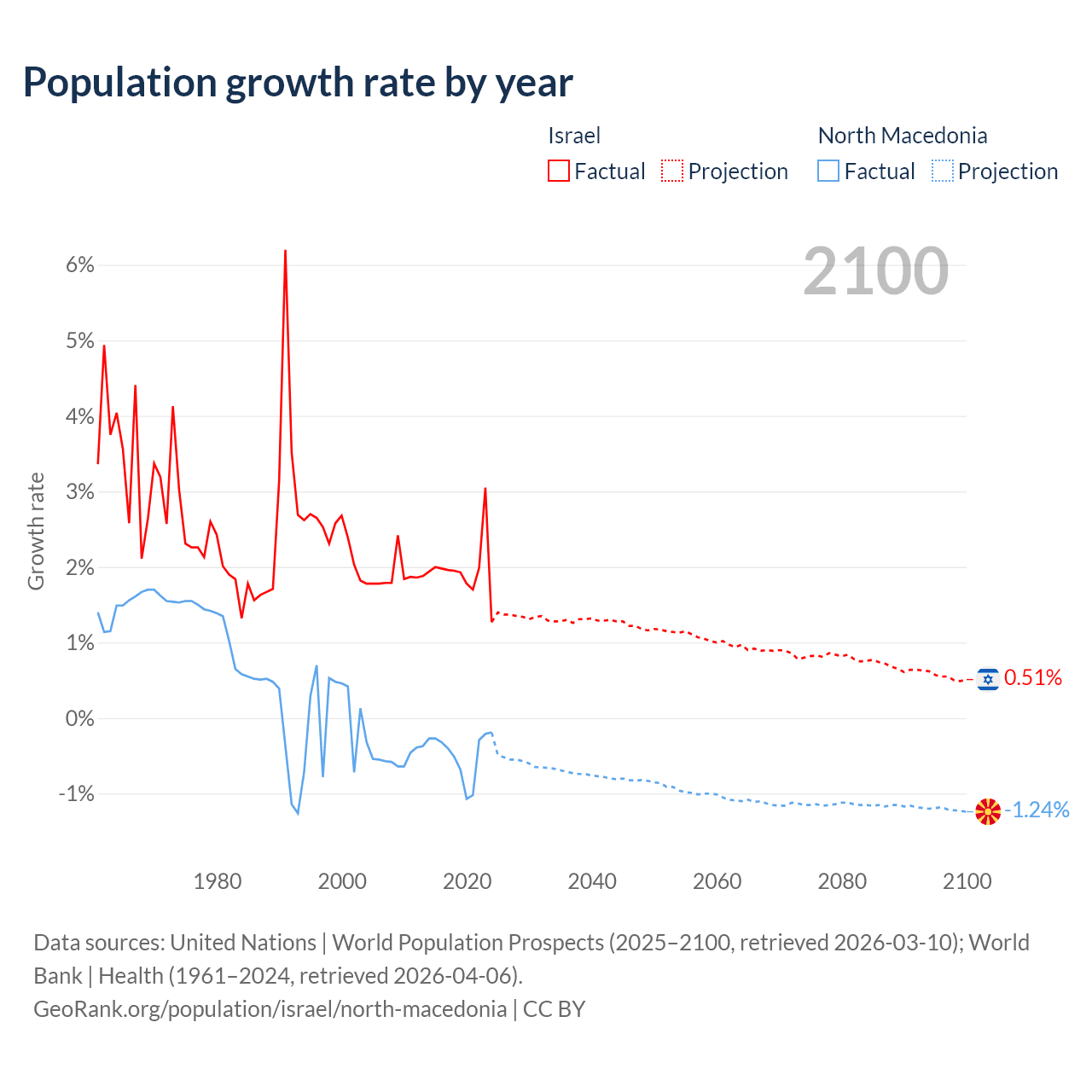 - For the last 10 years, Israel has had an average growth rate of +1.96% per year vs -0.48% in North Macedonia.