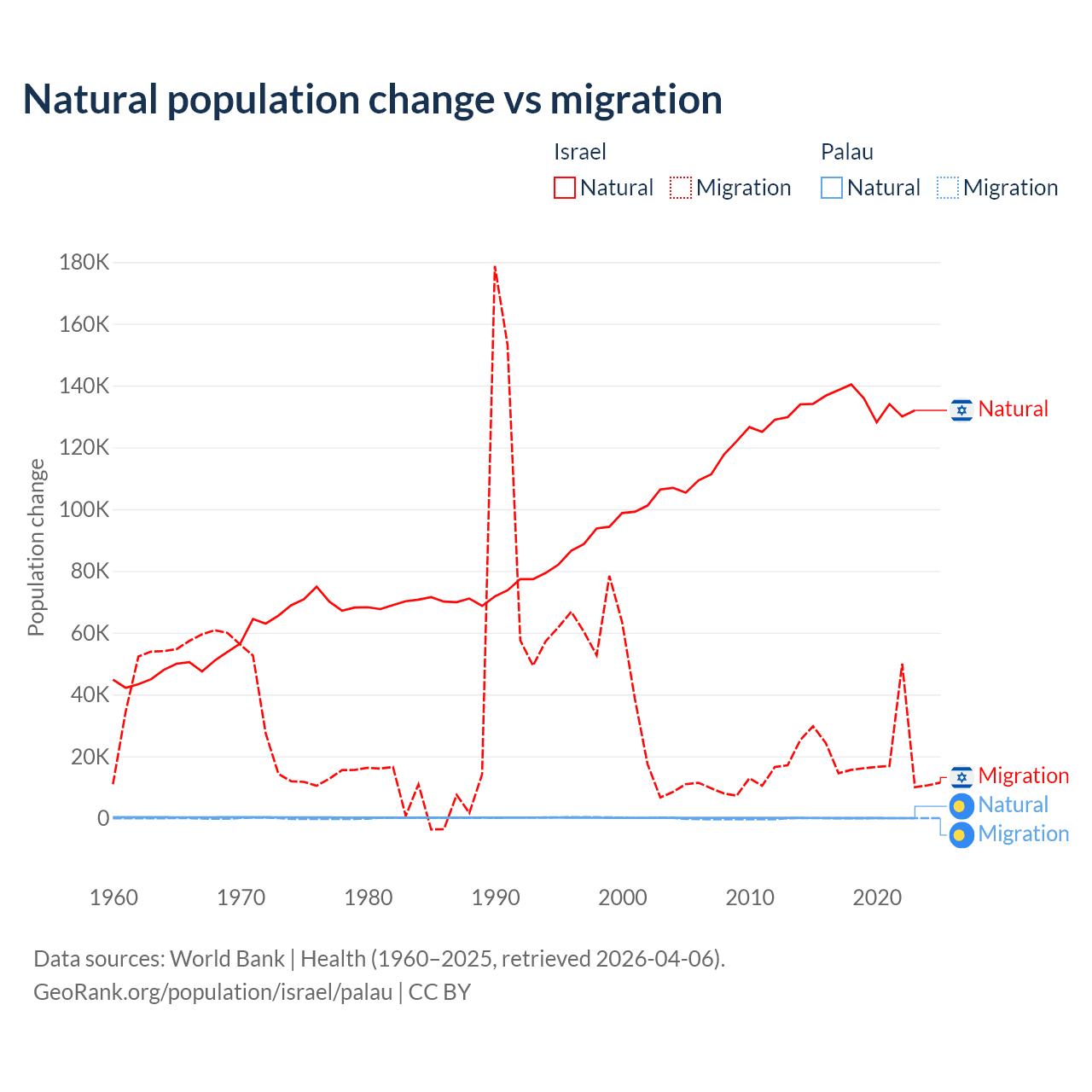 Over the last 10 years, 86% of the population change in Israel is from natural causes (a gain of 1,343,492 people) and 14% is from migration (a gain of 219,048 people). In Palau 53.8% is from natural causes (a gain of 264 people) and 46.2% is from migration (a loss of 227 people).