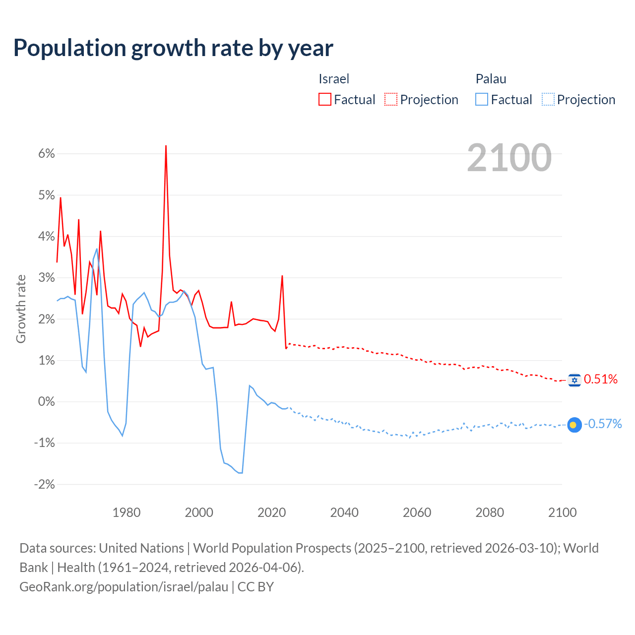 - For the last 10 years, Israel has had an average growth rate of +1.96% per year vs +0.02% in Palau.