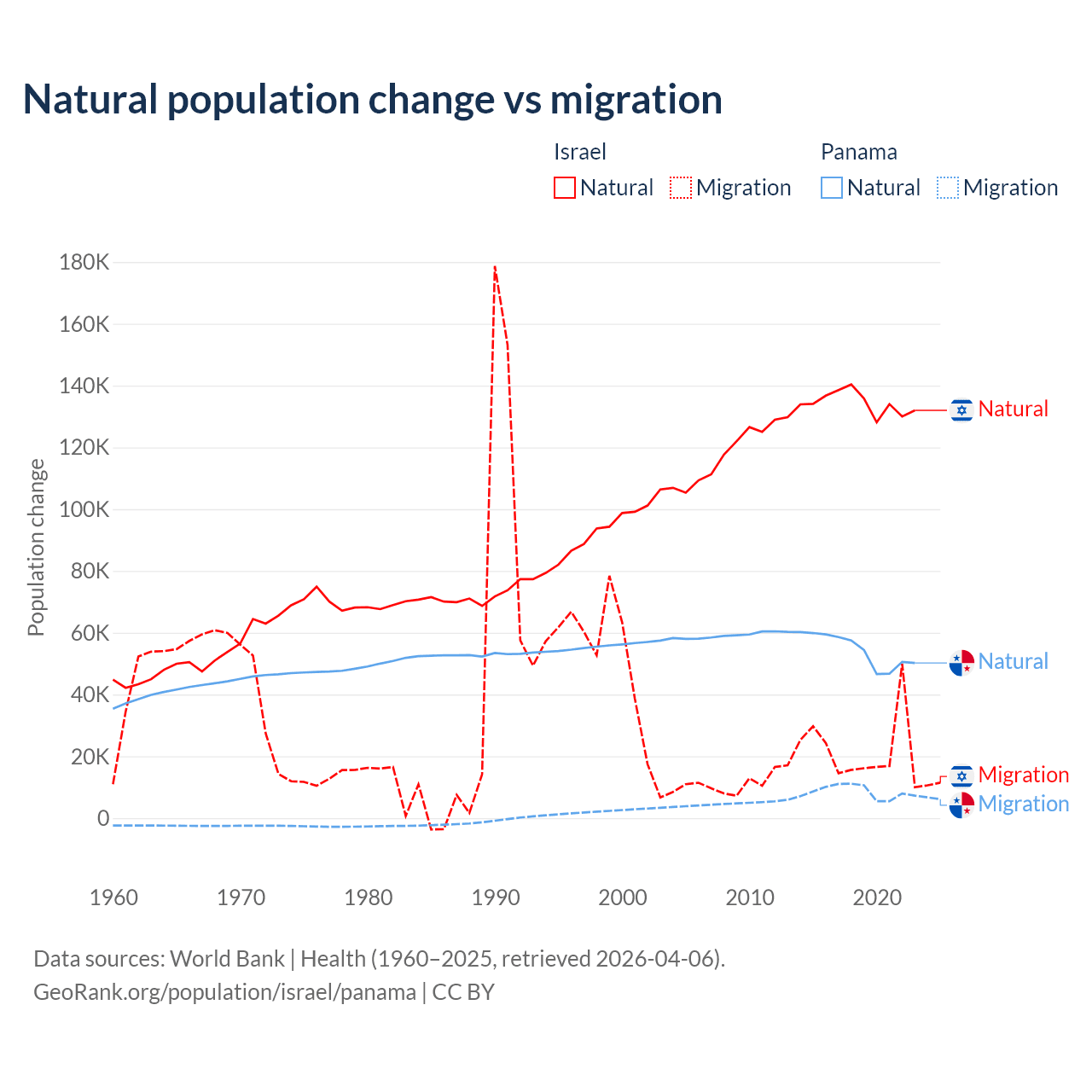 Over the last 10 years, 86% of the population change in Israel is from natural causes (a gain of 1,343,492 people) and 14% is from migration (a gain of 219,048 people). In Panama 86.5% is from natural causes (a gain of 544,211 people) and 13.5% is from migration (a gain of 84,849 people).