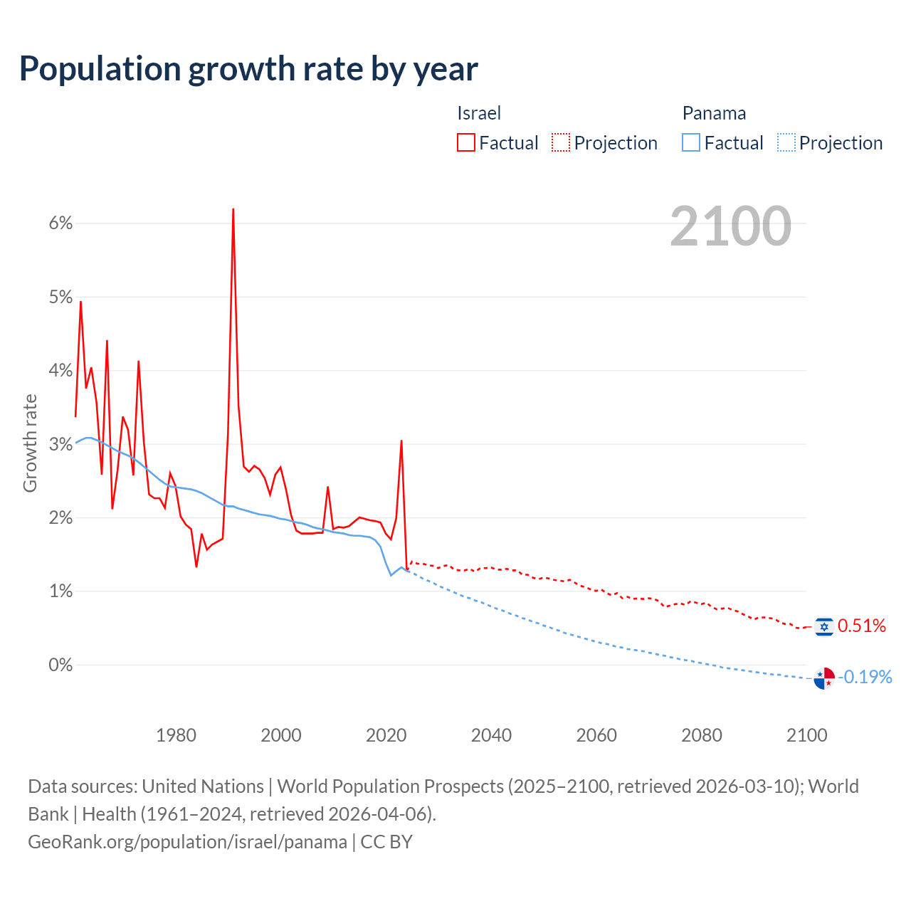 - For the last 10 years, Israel has had an average growth rate of +1.96% per year vs +1.52% in Panama.