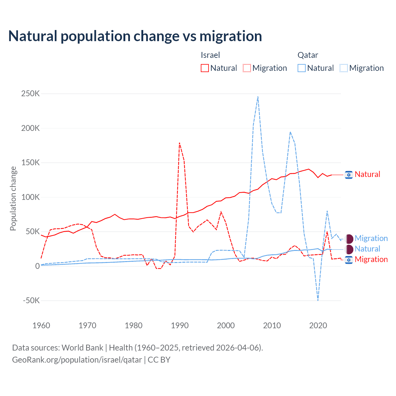 Over the last 10 years, 86% of the population change in Israel is from natural causes (a gain of 1,343,492 people) and 14% is from migration (a gain of 219,048 people). In Qatar 26.1% is from natural causes (a gain of 232,009 people) and 73.9% is from migration (a gain of 655,712 people).
