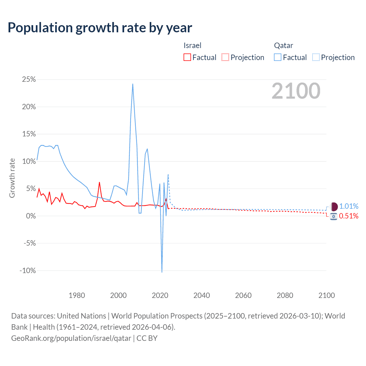 - For the last 10 years, Israel has had an average growth rate of +1.96% per year vs +3.86% in Qatar.