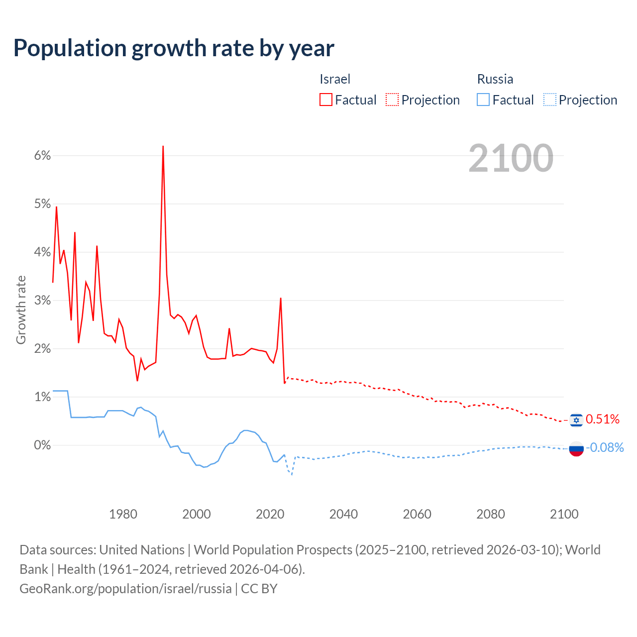 - For the last 10 years, Israel has had an average growth rate of +1.96% per year vs -0.02% in Russia.