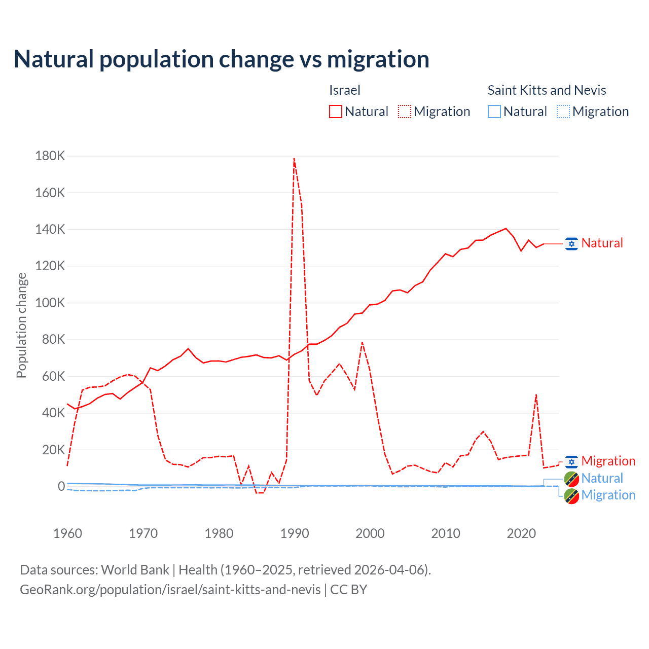 Over the last 10 years, 86% of the population change in Israel is from natural causes (a gain of 1,343,492 people) and 14% is from migration (a gain of 219,048 people). In Saint Kitts and Nevis 44.9% is from natural causes (a gain of 1,225 people) and 55.1% is from migration (a loss of 1,506 people).