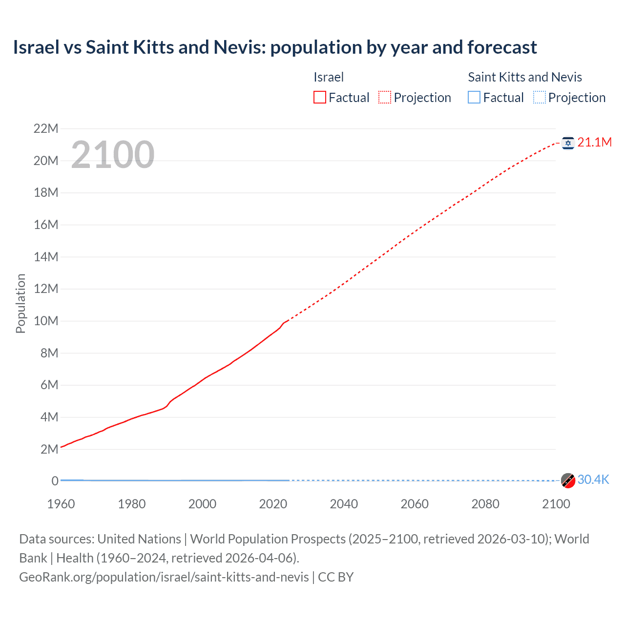 Israel vs Saint Kitts and Nevis: population by year and forecast