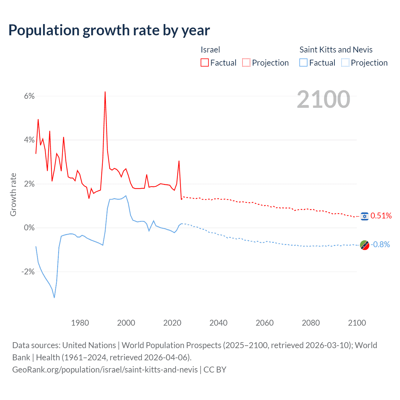 - For the last 10 years, Israel has had an average growth rate of +1.96% per year vs -0.04% in Saint Kitts and Nevis.