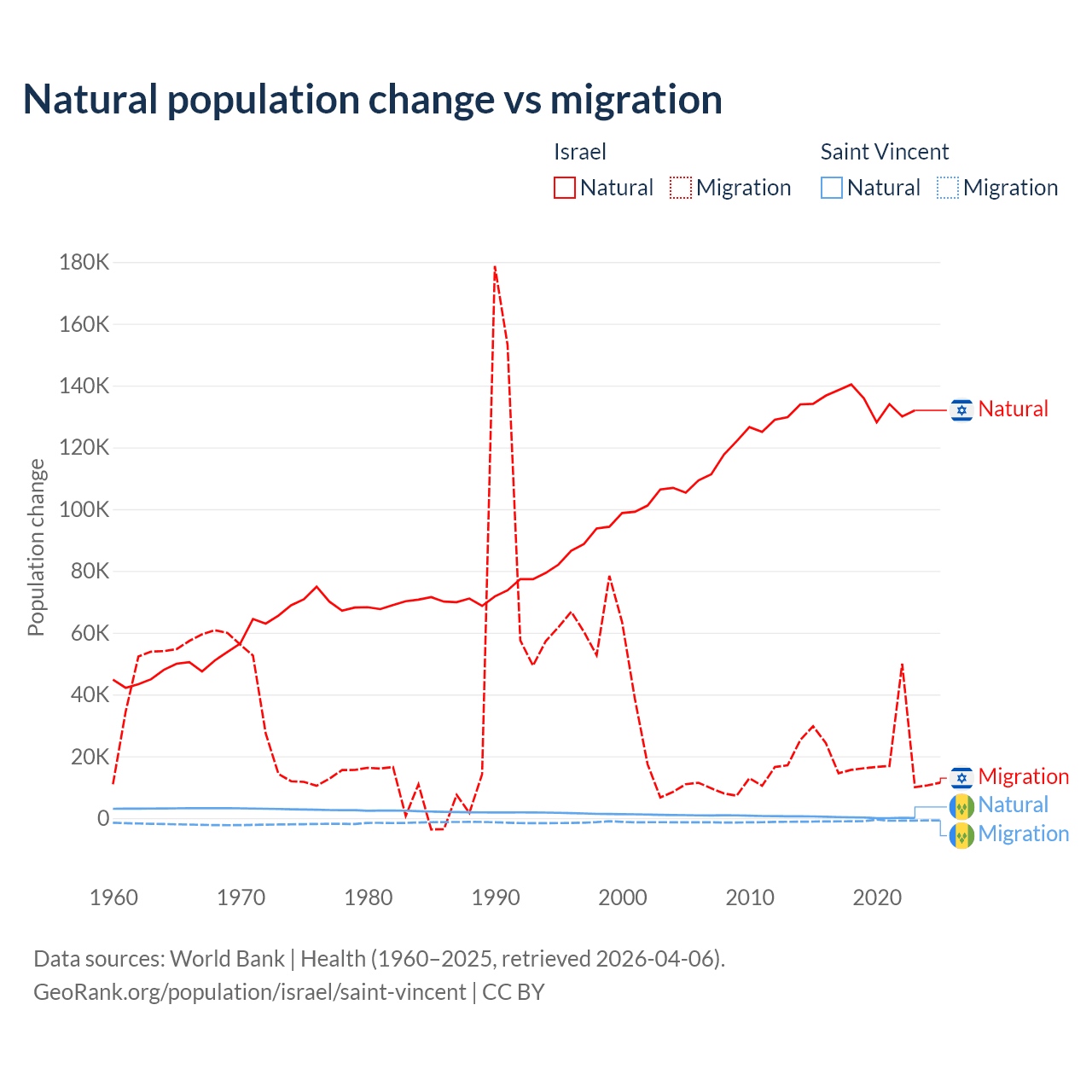 Over the last 10 years, 86% of the population change in Israel is from natural causes (a gain of 1,343,492 people) and 14% is from migration (a gain of 219,048 people). In Saint Vincent 21.2% is from natural causes (a gain of 2,525 people) and 78.8% is from migration (a loss of 9,393 people).
