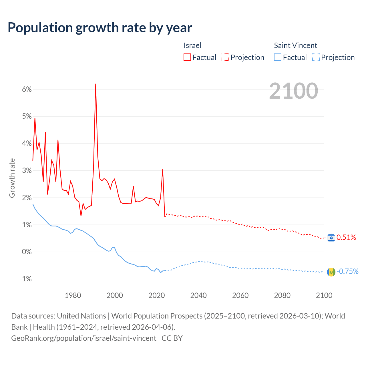 - For the last 10 years, Israel has had an average growth rate of +1.96% per year vs -0.65% in Saint Vincent.