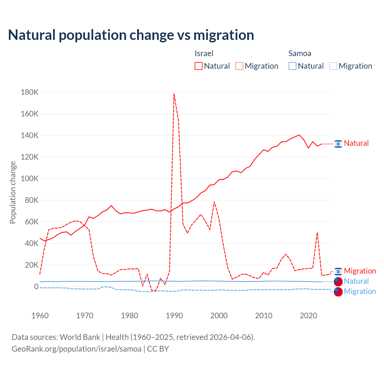 Over the last 10 years, 86% of the population change in Israel is from natural causes (a gain of 1,343,492 people) and 14% is from migration (a gain of 219,048 people). In Samoa 62.5% is from natural causes (a gain of 45,436 people) and 37.5% is from migration (a loss of 27,246 people).