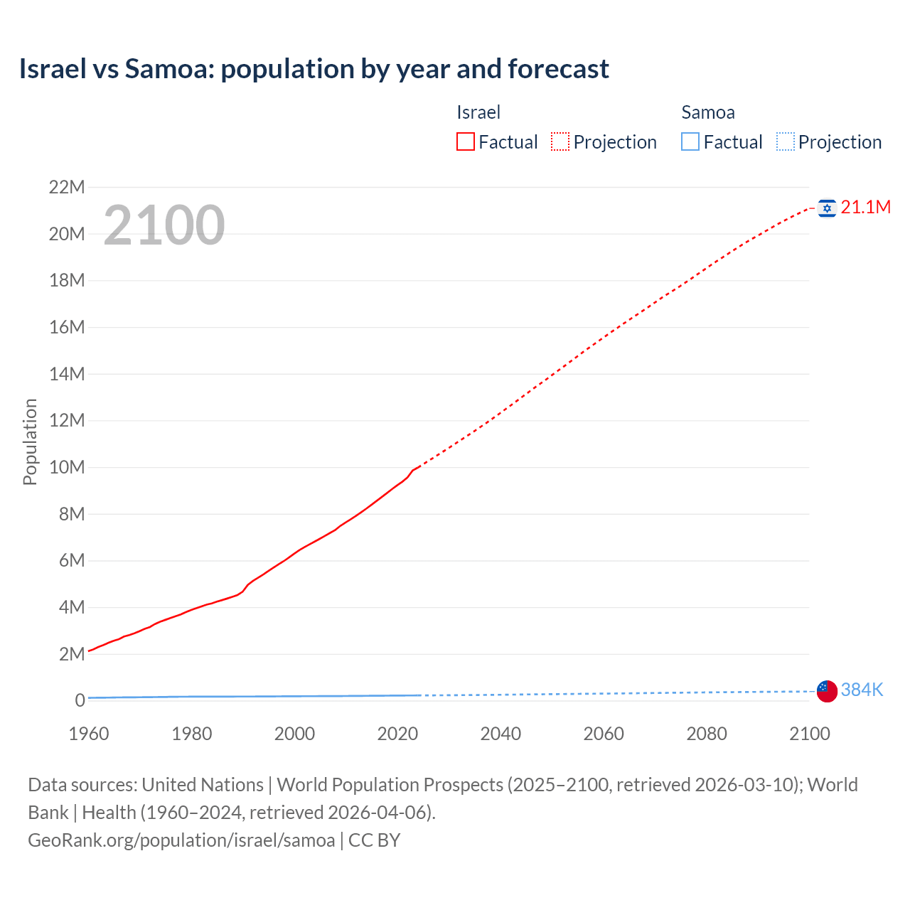 The latest officially reported population of Israel was 9,974,400 in 2024 vs 218,019 people in Samoa in 2024. In 2026, based on the adjusted UN estimation, the current Israel's population is 10,290,887 people compared to 220,932 in Samoa.