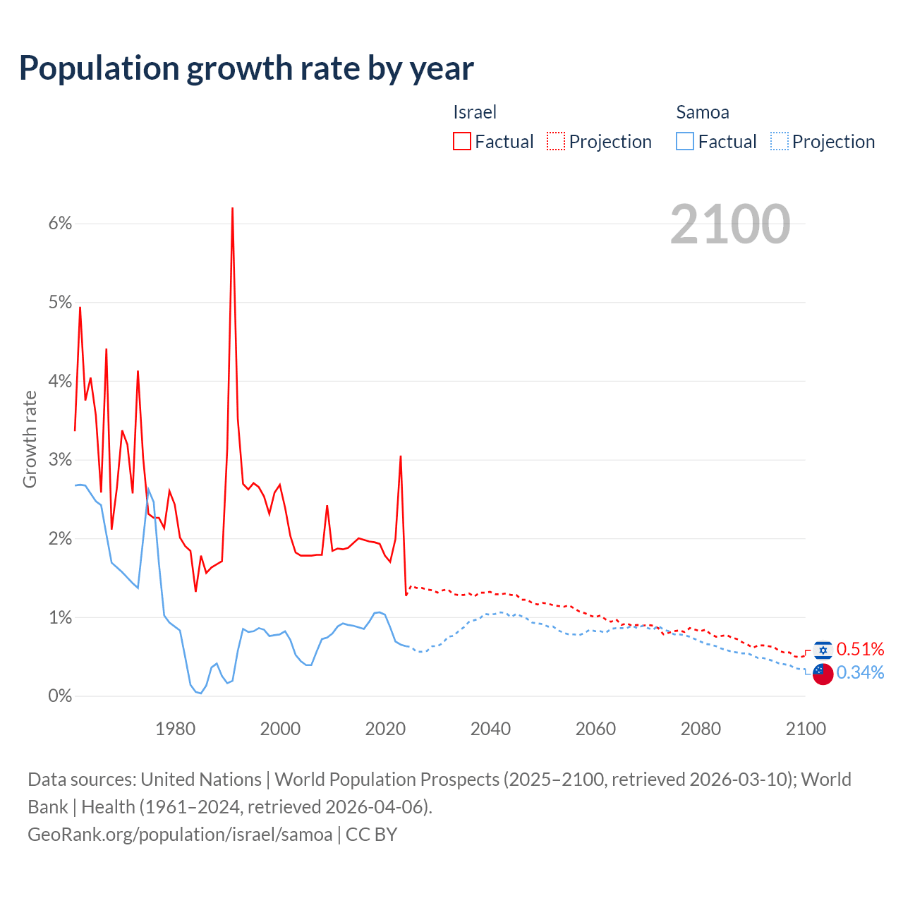- For the last 10 years, Israel has had an average growth rate of +1.96% per year vs +0.87% in Samoa.