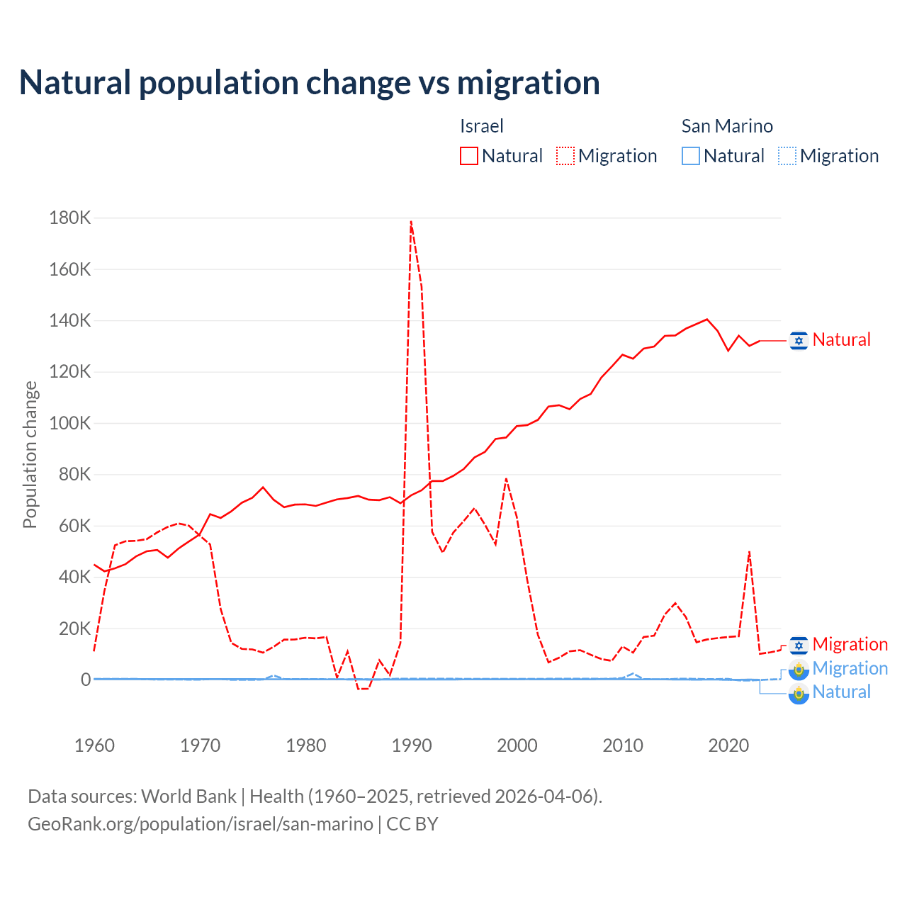 Over the last 10 years, 86% of the population change in Israel is from natural causes (a gain of 1,343,492 people) and 14% is from migration (a gain of 219,048 people). In San Marino 40.9% is from natural causes (a loss of 358 people) and 59.1% is from migration (a gain of 517 people).