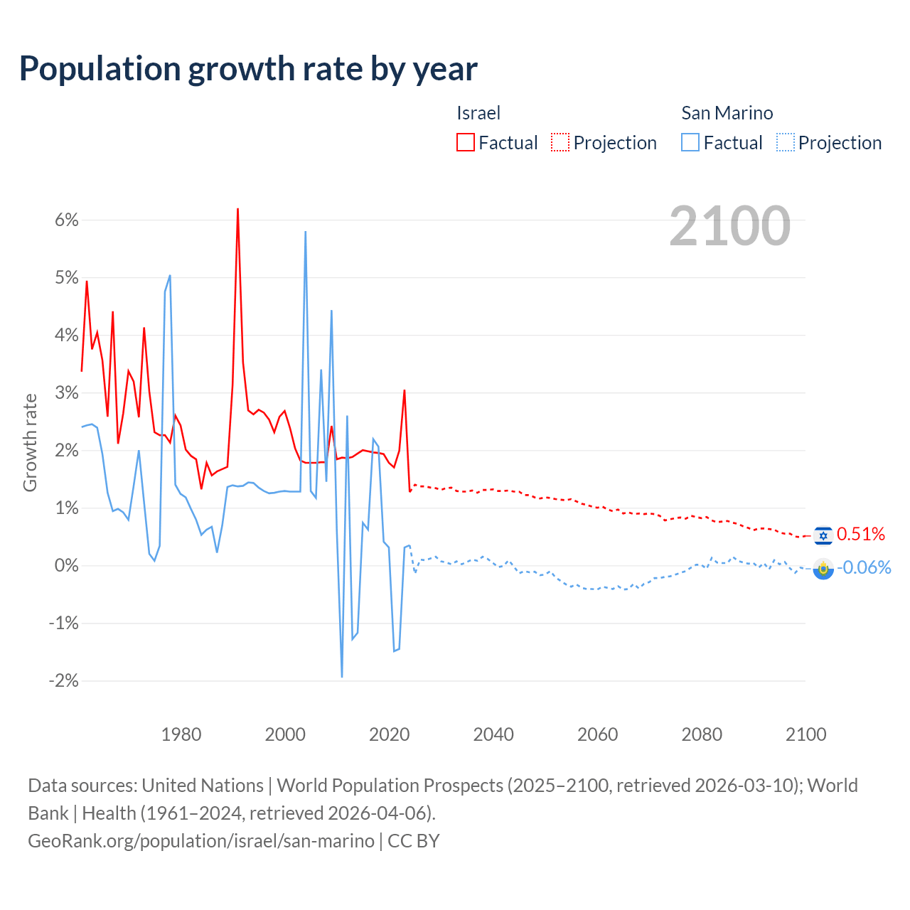 - For the last 10 years, Israel has had an average growth rate of +1.96% per year vs +0.26% in San Marino.