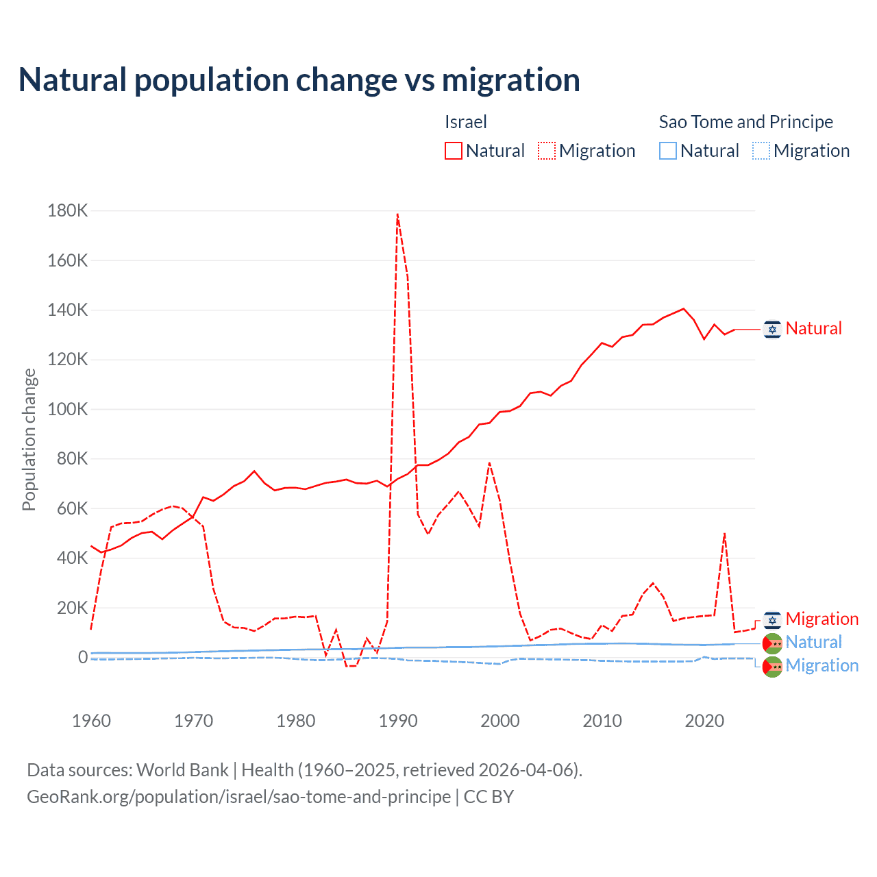 Over the last 10 years, 86% of the population change in Israel is from natural causes (a gain of 1,343,492 people) and 14% is from migration (a gain of 219,048 people). In Sao Tome and Principe 80.1% is from natural causes (a gain of 50,822 people) and 19.9% is from migration (a loss of 12,621 people).