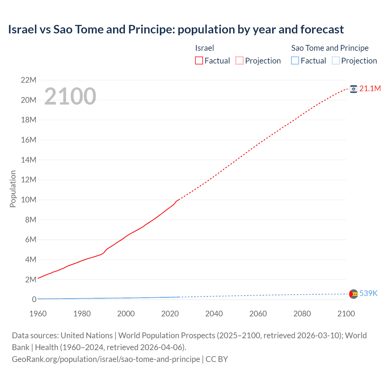 The latest officially reported population of Israel was 9,974,400 in 2024 vs 235,536 people in Sao Tome and Principe in 2024. In 2026, based on the adjusted UN estimation, the current Israel's population is 10,290,887 people compared to 246,362 in Sao Tome and Principe.