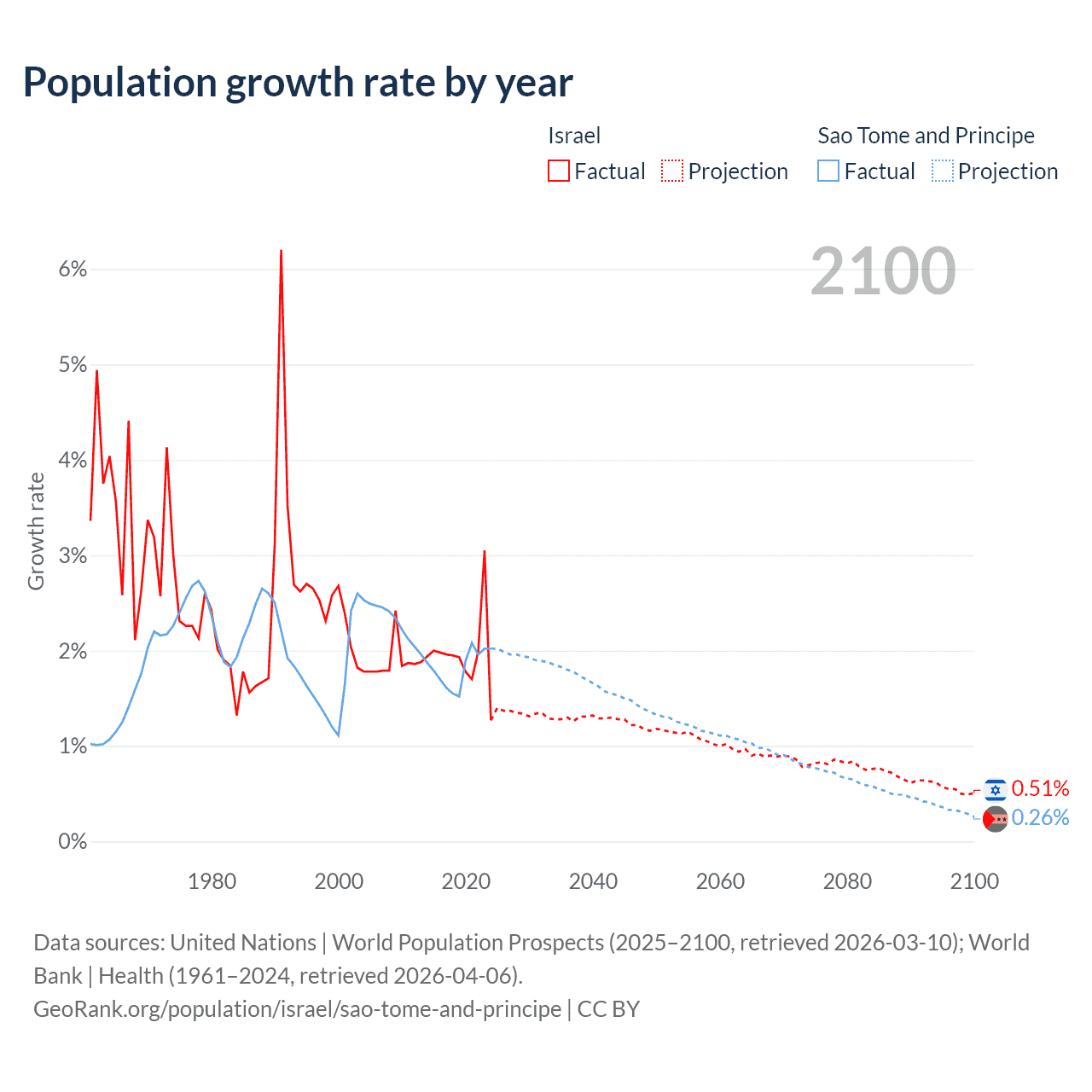 - For the last 10 years, Israel has had an average growth rate of +1.96% per year vs +1.82% in Sao Tome and Principe.