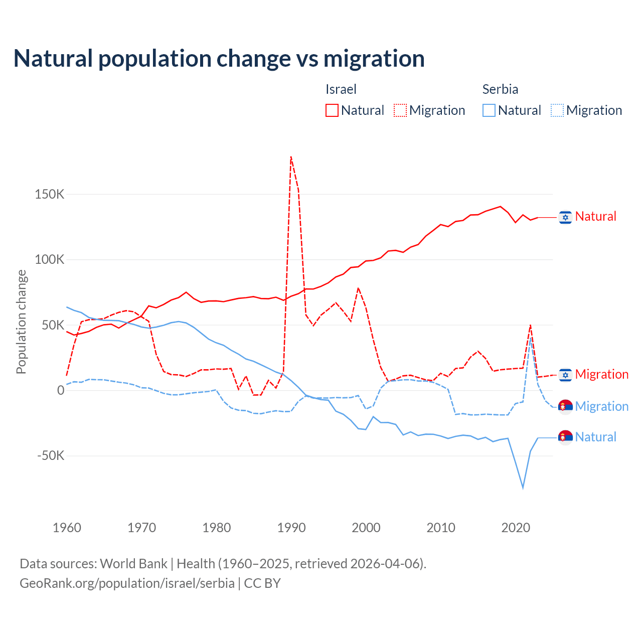 Over the last 10 years, 86% of the population change in Israel is from natural causes (a gain of 1,343,492 people) and 14% is from migration (a gain of 219,048 people). In Serbia 83.3% is from natural causes (a loss of 435,148 people) and 16.7% is from migration (a loss of 87,110 people).
