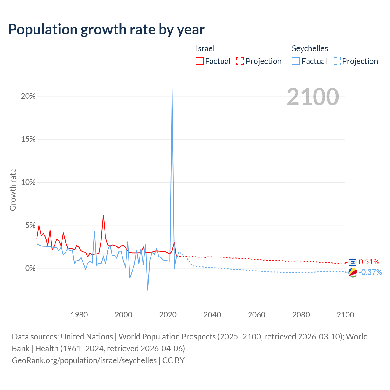- For the last 10 years, Israel has had an average growth rate of +1.96% per year vs +2.9% in the Seychelles.