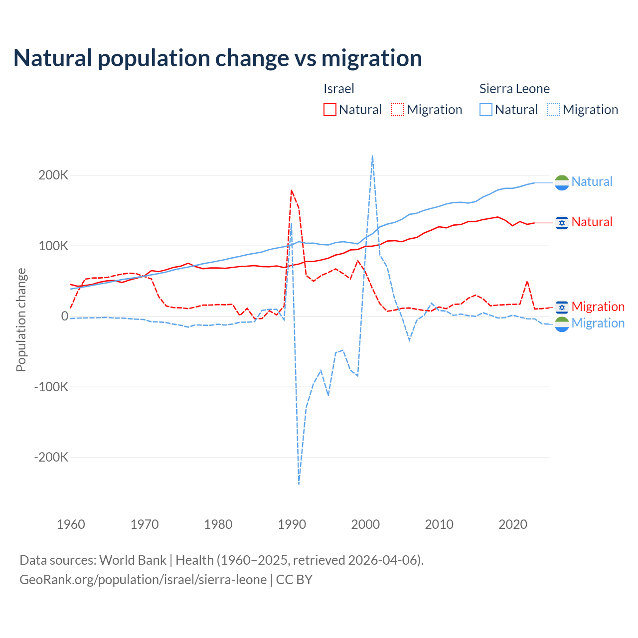 Over the last 10 years, 86% of the population change in Israel is from natural causes (a gain of 1,343,492 people) and 14% is from migration (a gain of 219,048 people). In Sierra Leone 99.6% is from natural causes (a gain of 1,764,049 people) and 0.41% is from migration (a loss of 7,211 people).