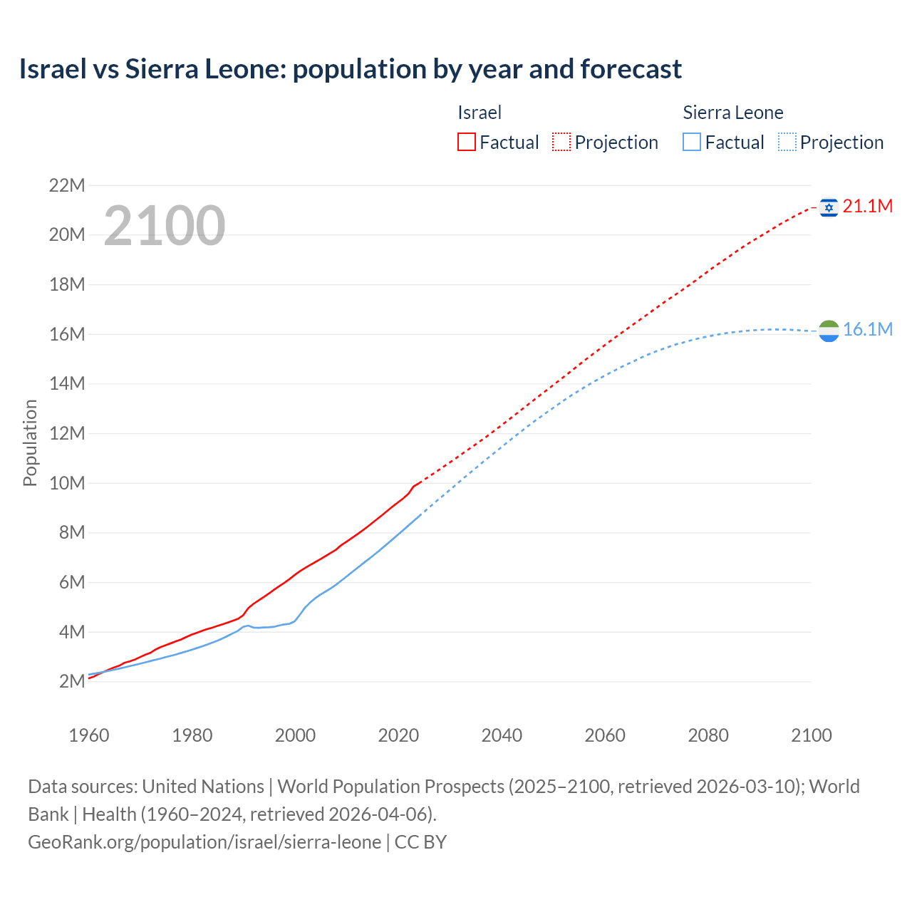 The latest officially reported population of Israel was 9,974,400 in 2024 vs 8,642,022 people in Sierra Leone in 2024. In 2026, based on the adjusted UN estimation, the current Israel's population is 10,290,887 people compared to 9,049,533 in Sierra Leone.