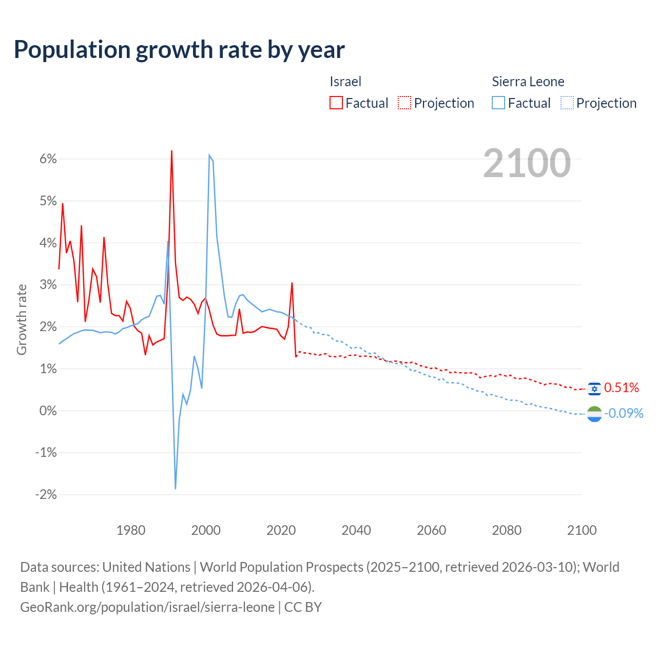 - For the last 10 years, Israel has had an average growth rate of +1.96% per year vs +2.32% in Sierra Leone.