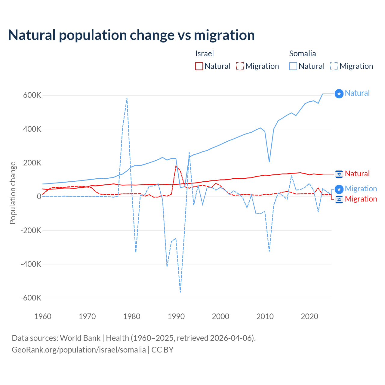Over the last 10 years, 86% of the population change in Israel is from natural causes (a gain of 1,343,492 people) and 14% is from migration (a gain of 219,048 people). In Somalia 94.4% is from natural causes (a gain of 5,270,105 people) and 5.58% is from migration (a gain of 311,487 people).
