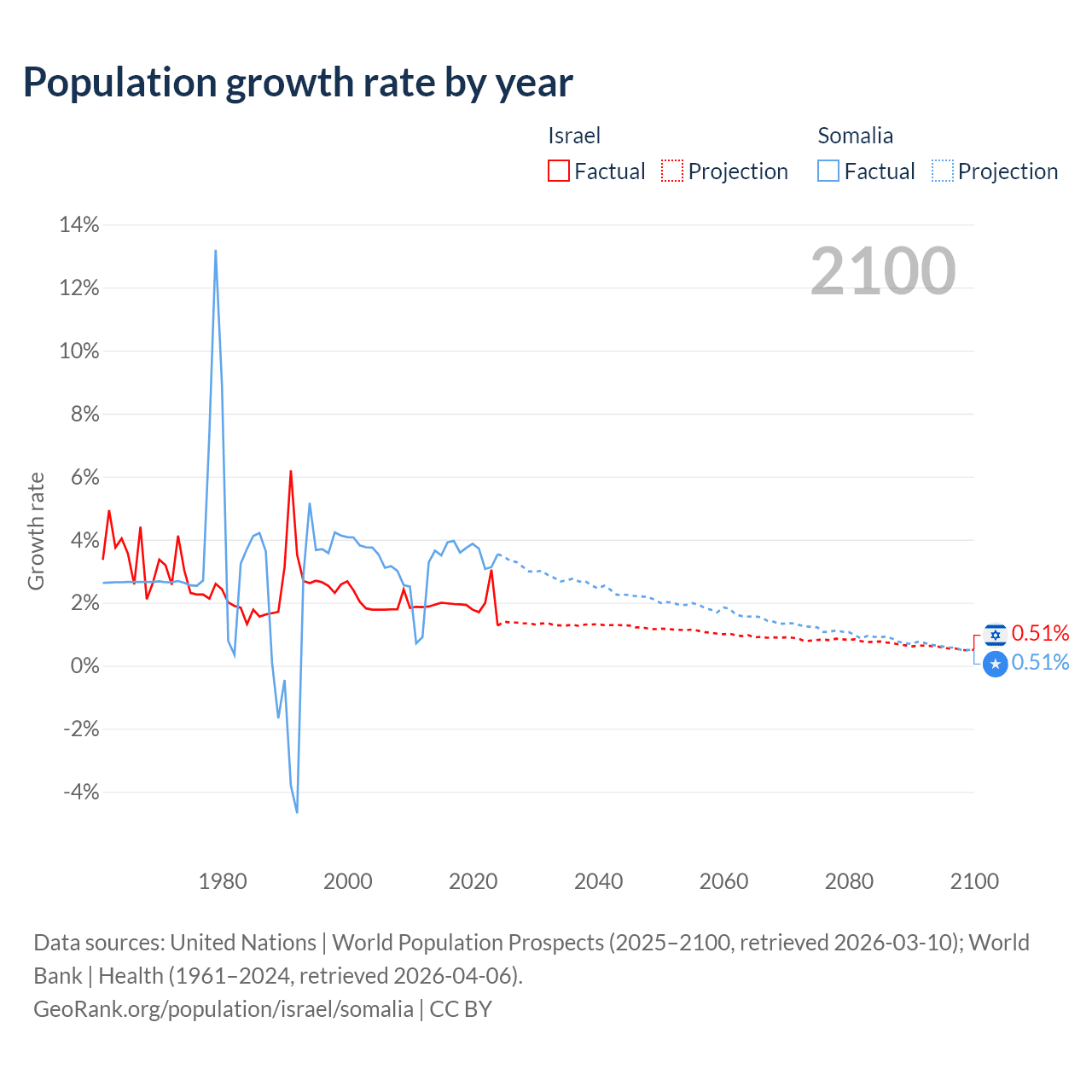 - For the last 10 years, Israel has had an average growth rate of +1.96% per year vs +3.61% in Somalia.