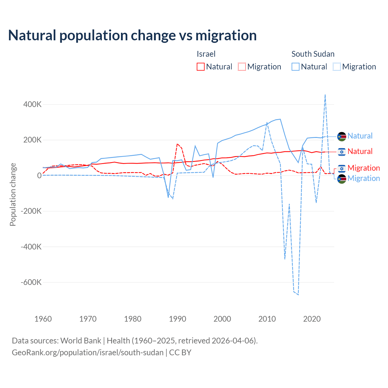Over the last 10 years, 86% of the population change in Israel is from natural causes (a gain of 1,343,492 people) and 14% is from migration (a gain of 219,048 people). In South Sudan 57.4% is from natural causes (a gain of 1,792,135 people) and 42.6% is from migration (a loss of 1,329,606 people).
