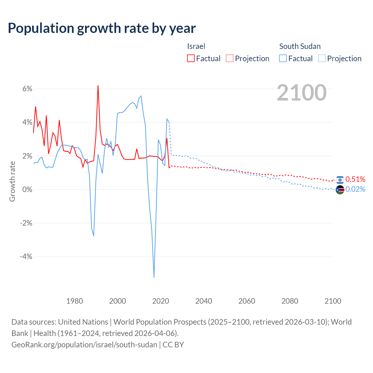 - For the last 10 years, Israel has had an average growth rate of +1.96% per year vs +0.65% in South Sudan.