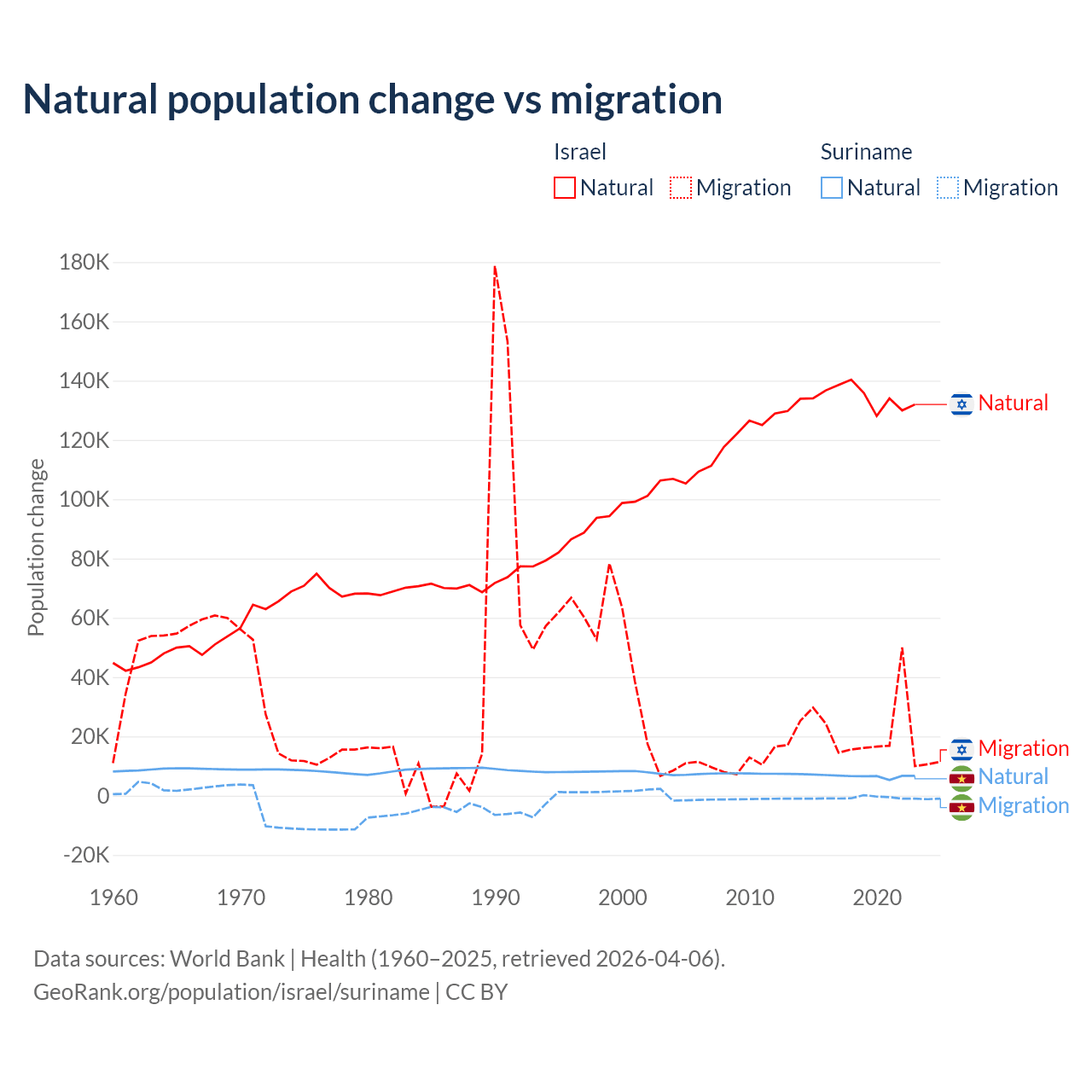 Over the last 10 years, 86% of the population change in Israel is from natural causes (a gain of 1,343,492 people) and 14% is from migration (a gain of 219,048 people). In Suriname 90.3% is from natural causes (a gain of 66,709 people) and 9.72% is from migration (a loss of 7,185 people).