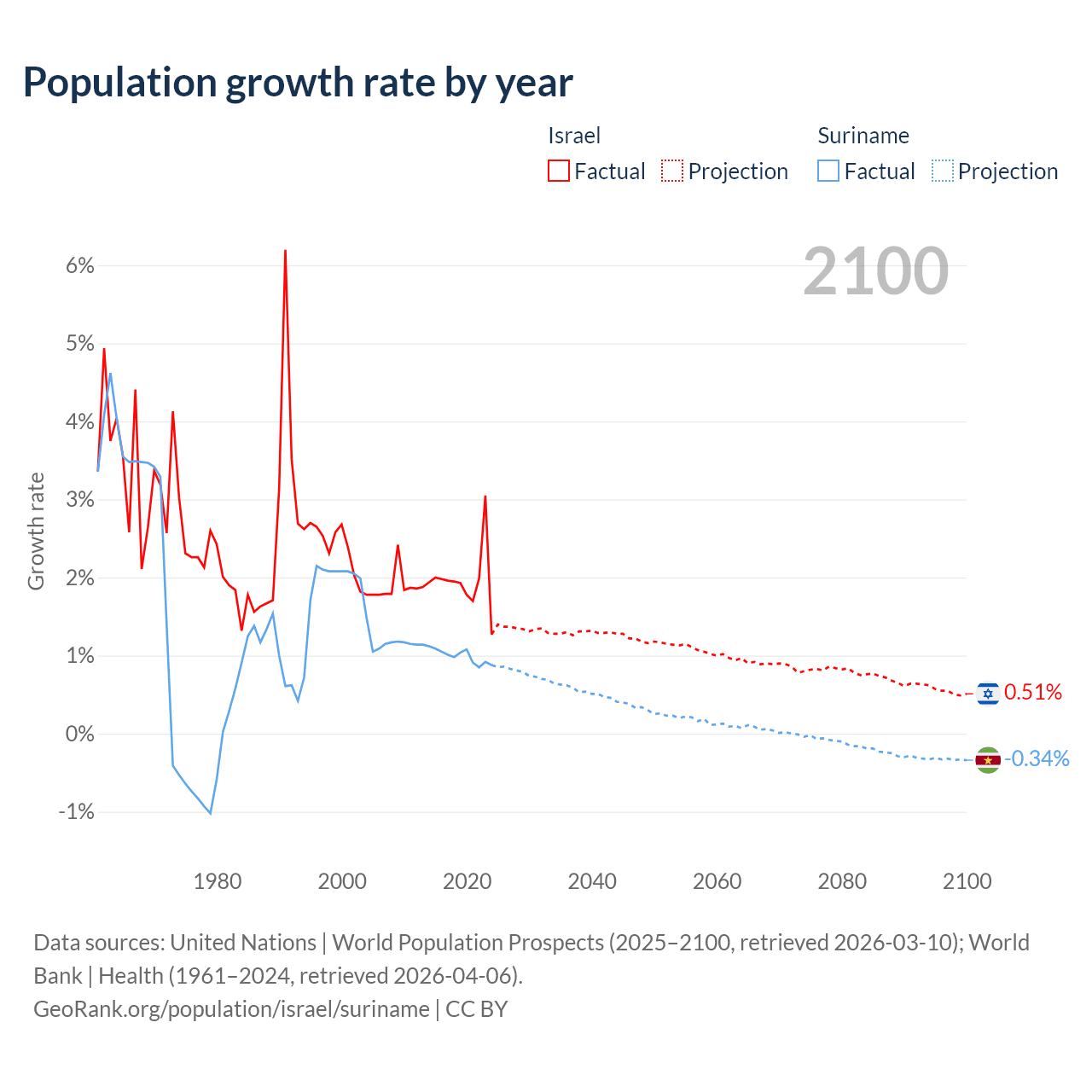 - For the last 10 years, Israel has had an average growth rate of +1.96% per year vs +0.99% in Suriname.