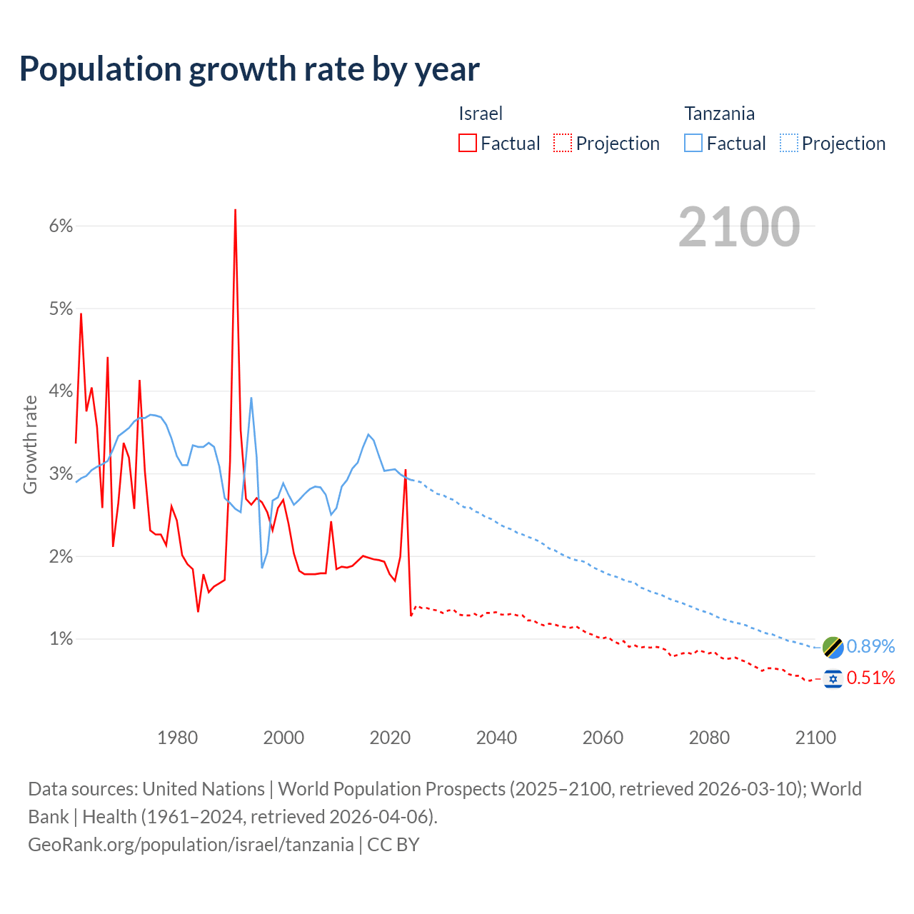 - For the last 10 years, Israel has had an average growth rate of +1.96% per year vs +3.13% in Tanzania.