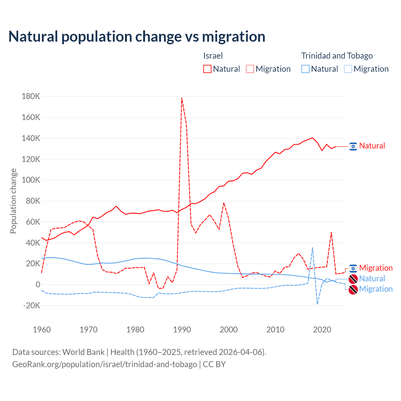 Over the last 10 years, 86% of the population change in Israel is from natural causes (a gain of 1,343,492 people) and 14% is from migration (a gain of 219,048 people). In Trinidad and Tobago 66% is from natural causes (a gain of 55,887 people) and 34% is from migration (a gain of 28,785 people).