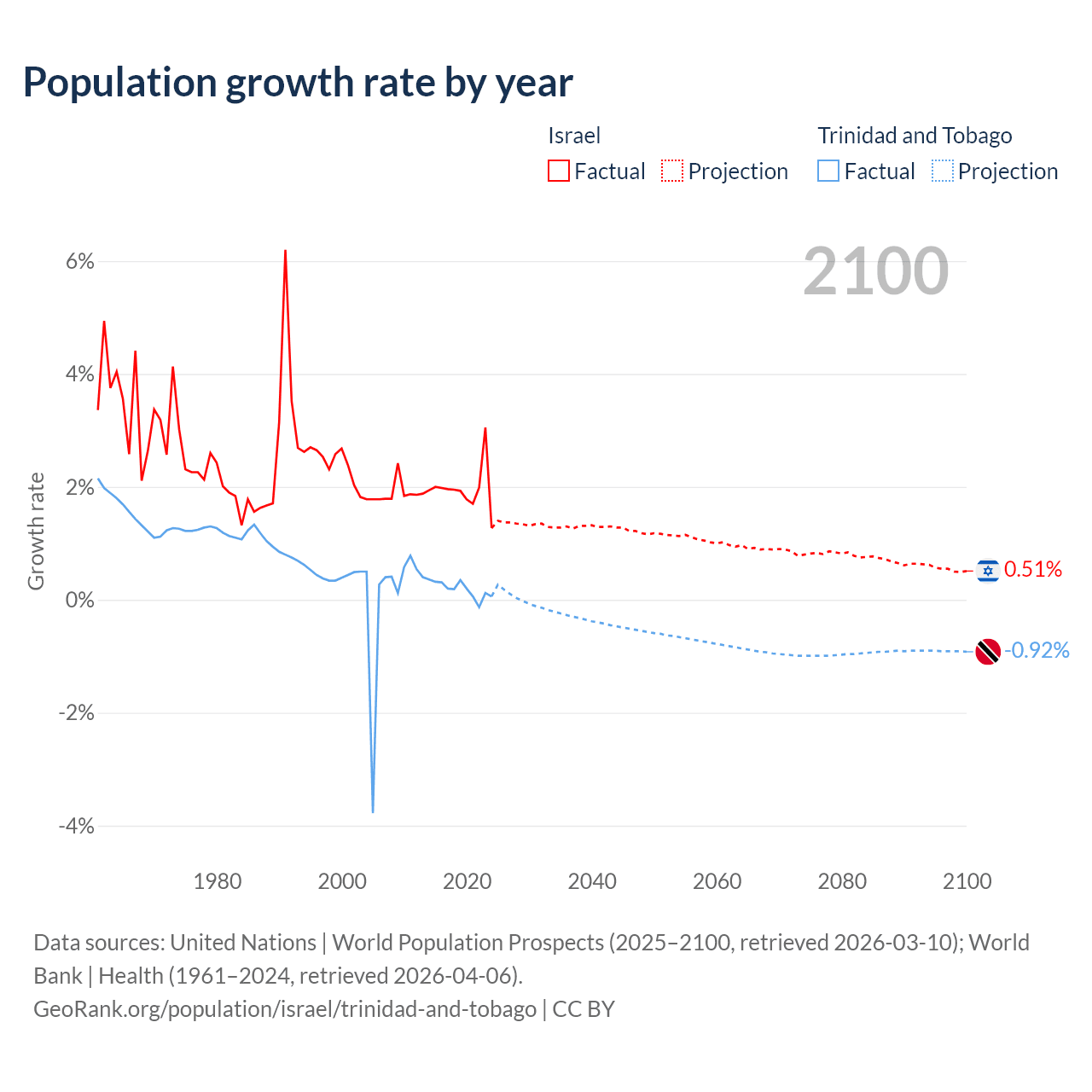 - For the last 10 years, Israel has had an average growth rate of +1.96% per year vs +0.19% in Trinidad and Tobago.