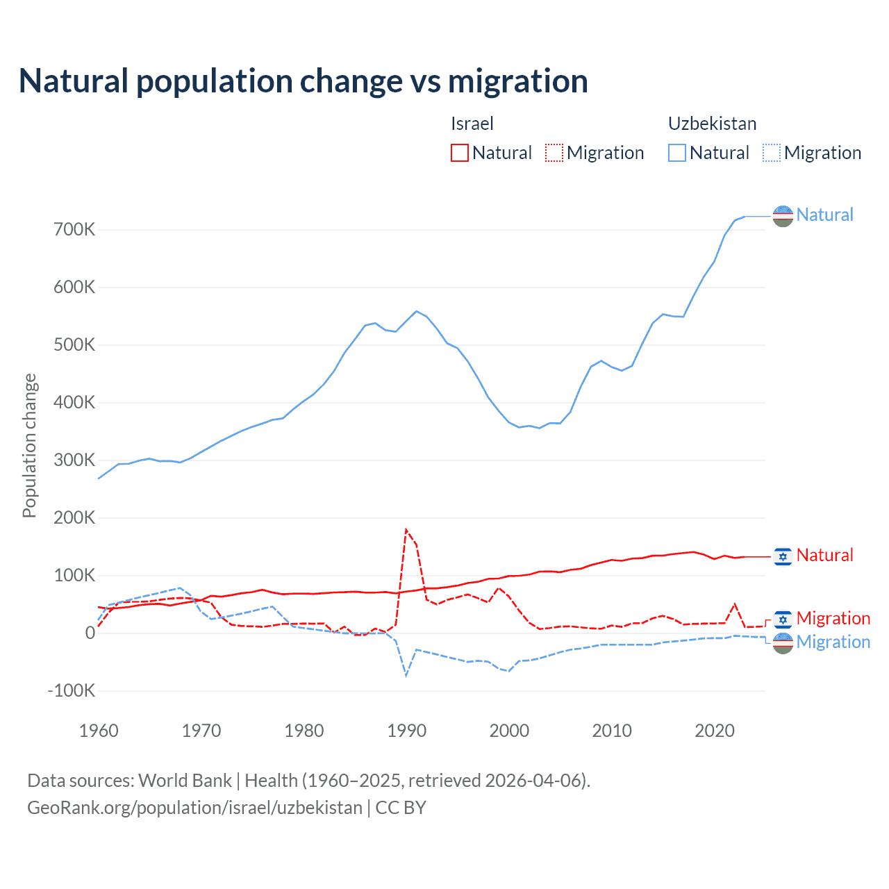 Over the last 10 years, 86% of the population change in Israel is from natural causes (a gain of 1,343,492 people) and 14% is from migration (a gain of 219,048 people). In Uzbekistan 98.2% is from natural causes (a gain of 6,161,117 people) and 1.84% is from migration (a loss of 115,398 people).