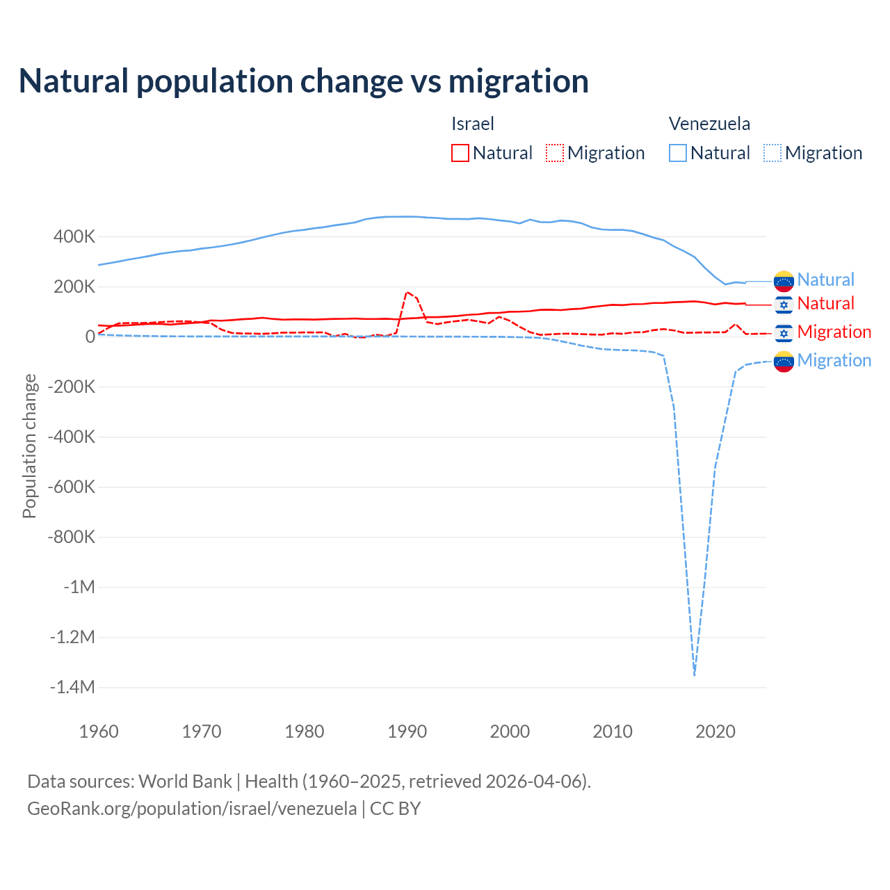 Over the last 10 years, 86% of the population change in Israel is from natural causes (a gain of 1,343,492 people) and 14% is from migration (a gain of 219,048 people). In Venezuela 38.6% is from natural causes (a gain of 2,946,257 people) and 61.4% is from migration (a loss of 4,683,227 people).