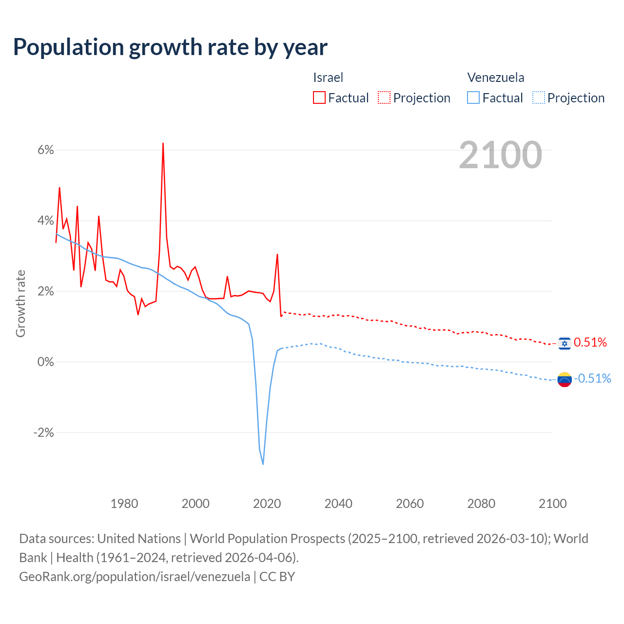 - For the last 10 years, Israel has had an average growth rate of +1.96% per year vs -0.46% in Venezuela.