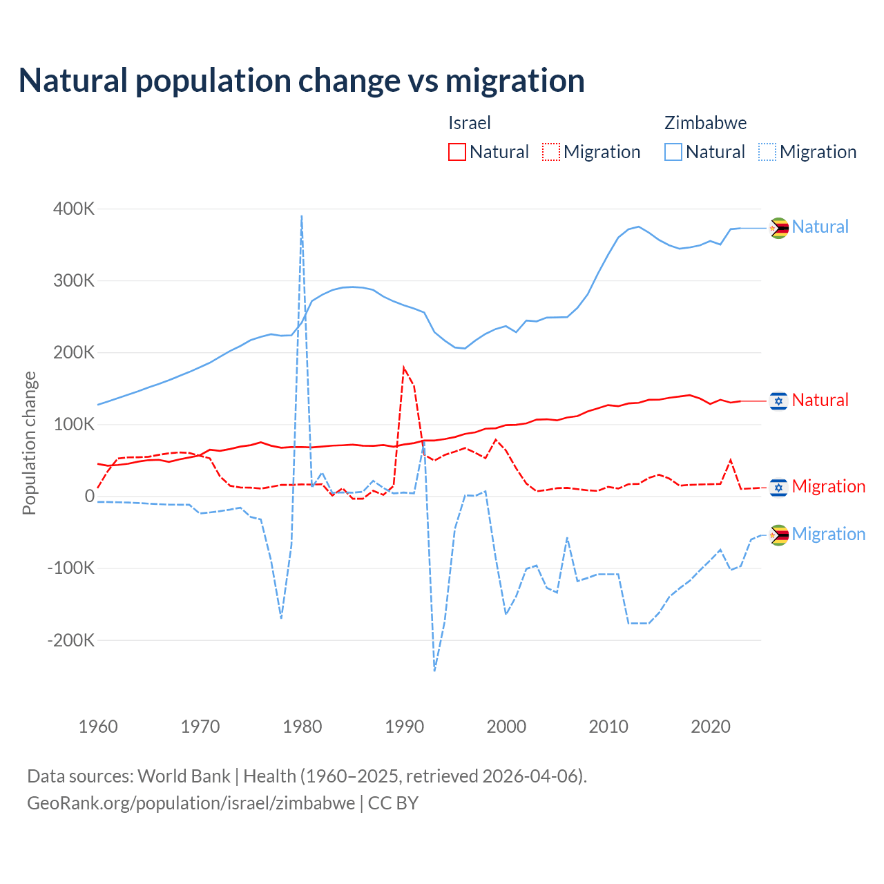 Over the last 10 years, 86% of the population change in Israel is from natural causes (a gain of 1,343,492 people) and 14% is from migration (a gain of 219,048 people). In Zimbabwe 74.9% is from natural causes (a gain of 3,558,487 people) and 25.1% is from migration (a loss of 1,192,807 people).