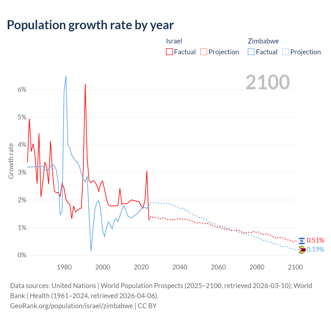 - For the last 10 years, Israel has had an average growth rate of +1.96% per year vs +1.57% in Zimbabwe.