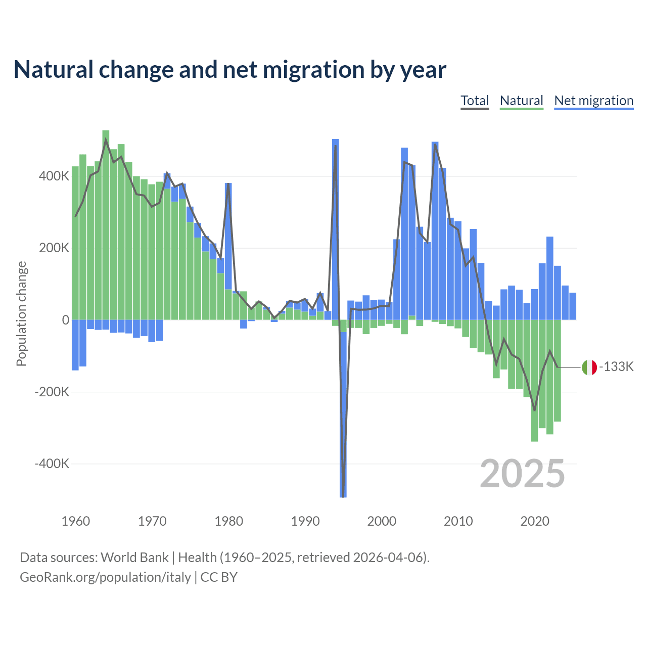 Over the last 10 years, 68.6% of the population change in Italy is from natural causes (a loss of 2,239,084 people) and 31.4% is from migration (a gain of 1,026,128 people).